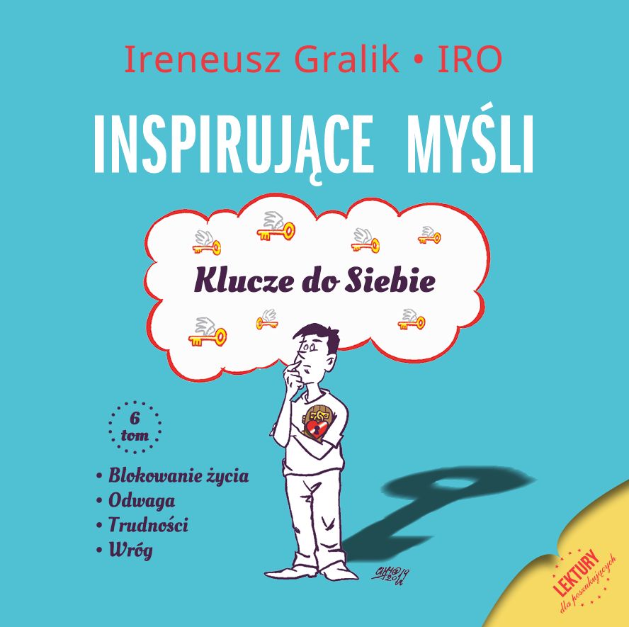 „Inspirujące Myśli – Klucze do Siebie”. Klucze służą: pobudzeniu, wyjaśnieniu, naprowadzeniu, podsunięciu, pomysłu lub podpowiedzi osobom je czytającym. W nich zawarta jest wiedza. Posiadają siłę, aby otworzyć Twoje, do tej pory szczelnie zamknięte wrota zrozumienia. To wystarcza, abyś ruszył z miejsca. To, co latami było dla Ciebie niedostępne, po ich przeczytaniu, uruchamia się samoczynnie. Wprowadza w Twoim życiu ciąg zdarzeń. Teraz w odróżnieniu od dotychczasowych przypadków, wejdziesz w te doświadczenia bez obaw i świadomie. Odpowiedzi zawsze przychodzą, ale wówczas, jeśli zadajesz pytania. Bez pytań o cel i istotę życia, jest się niesionym przez jego silny nurt, w wiele miejsc. Rozwiązania są konstruktywne, ponieważ nareszcie zaczynasz zadawać je sobie, a nie innym. W całości, w siedmiu tomach w komplecie, jest ponad 560 Myśli-Kluczy. Powstają, kiedy rano piszę kolejne teksty. Niektóre, ale zdecydowana mniejszość została powołana do życia, w trakcie toczącego się dnia. Tych jest niewiele. Harmider ziemskich wydarzeń i zaangażowanie w codzienne zajęcia zakłócają przynoszone informacje. Kiedy piszę, jestem w środku dawanych wskazówek. Potocznie się myśli i mówi, że one wypływają z głowy autora, ale twierdzę, że jest to o wiele więcej niż tylko własna koncepcja. Jeśli choć jedna Inspirująca Myśl, pomoże Tobie droga czytelniczko, czy Tobie cenny poszukiwaczu, to wiem, że nadal będę miał siły do wstawania przed świtem, aby po – wstawały kolejne treści. Życzę każdemu, aby odnalazł w nich to, czego poszukuje. [Irenesz Gralik]