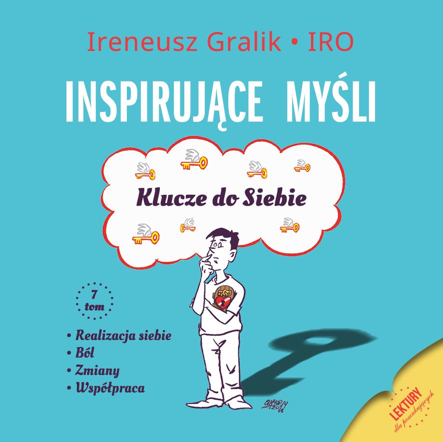 „Inspirujące Myśli – Klucze do Siebie”. Klucze służą: pobudzeniu, wyjaśnieniu, naprowadzeniu, podsunięciu, pomysłu lub podpowiedzi osobom je czytającym. W nich zawarta jest wiedza. Posiadają siłę, aby otworzyć Twoje, do tej pory szczelnie zamknięte wrota zrozumienia. To wystarcza, abyś ruszył z miejsca. To, co latami było dla Ciebie niedostępne, po ich przeczytaniu, uruchamia się samoczynnie. Wprowadza w Twoim życiu ciąg zdarzeń. Teraz w odróżnieniu od dotychczasowych przypadków, wejdziesz w te doświadczenia bez obaw i świadomie. Odpowiedzi zawsze przychodzą, ale wówczas, jeśli zadajesz pytania. Bez pytań o cel i istotę życia, jest się niesionym przez jego silny nurt, w wiele miejsc. Rozwiązania są konstruktywne, ponieważ nareszcie zaczynasz zadawać je sobie, a nie innym. W całości, w siedmiu tomach w komplecie, jest ponad 560 Myśli-Kluczy. Powstają, kiedy rano piszę kolejne teksty. Niektóre, ale zdecydowana mniejszość została powołana do życia, w trakcie toczącego się dnia. Tych jest niewiele. Harmider ziemskich wydarzeń i zaangażowanie w codzienne zajęcia zakłócają przynoszone informacje. Kiedy piszę, jestem w środku dawanych wskazówek. Potocznie się myśli i mówi, że one wypływają z głowy autora, ale twierdzę, że jest to o wiele więcej niż tylko własna koncepcja. Jeśli choć jedna Inspirująca Myśl, pomoże Tobie droga czytelniczko, czy Tobie cenny poszukiwaczu, to wiem, że nadal będę miał siły do wstawania przed świtem, aby po – wstawały kolejne treści. Życzę każdemu, aby odnalazł w nich to, czego poszukuje. [Irenesz Gralik]
